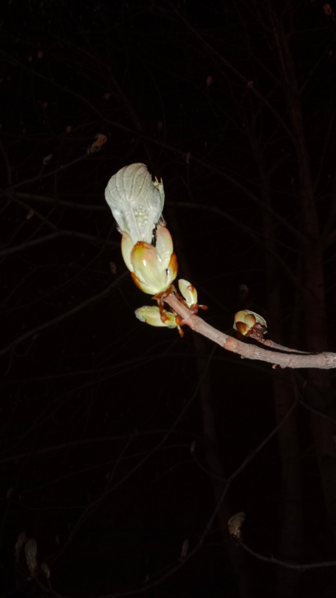 The image displays a close-up of a tree branch with several developing buds against a deeply dark background. The central and most prominent feature is a large bud, partially open, revealing pale gree…read more