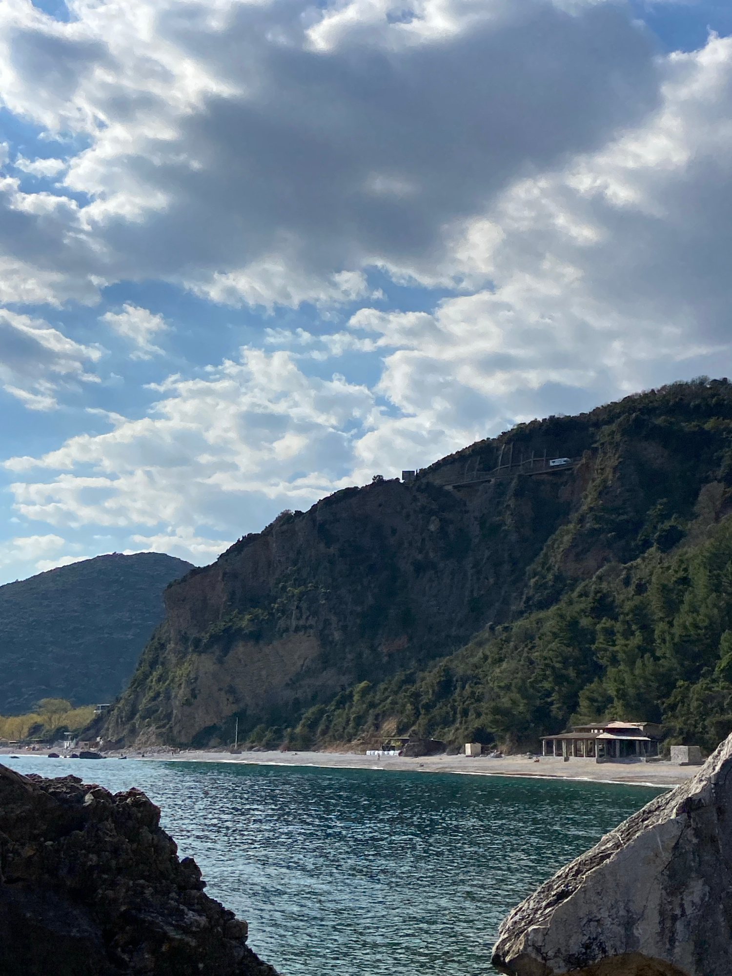 The image shows a coastal scene in Prijevor, Montenegro. The view is from a rocky outcrop, looking out towards a narrow beach at the foot of a steep, forested hillside. The water is visible on the rig…read more