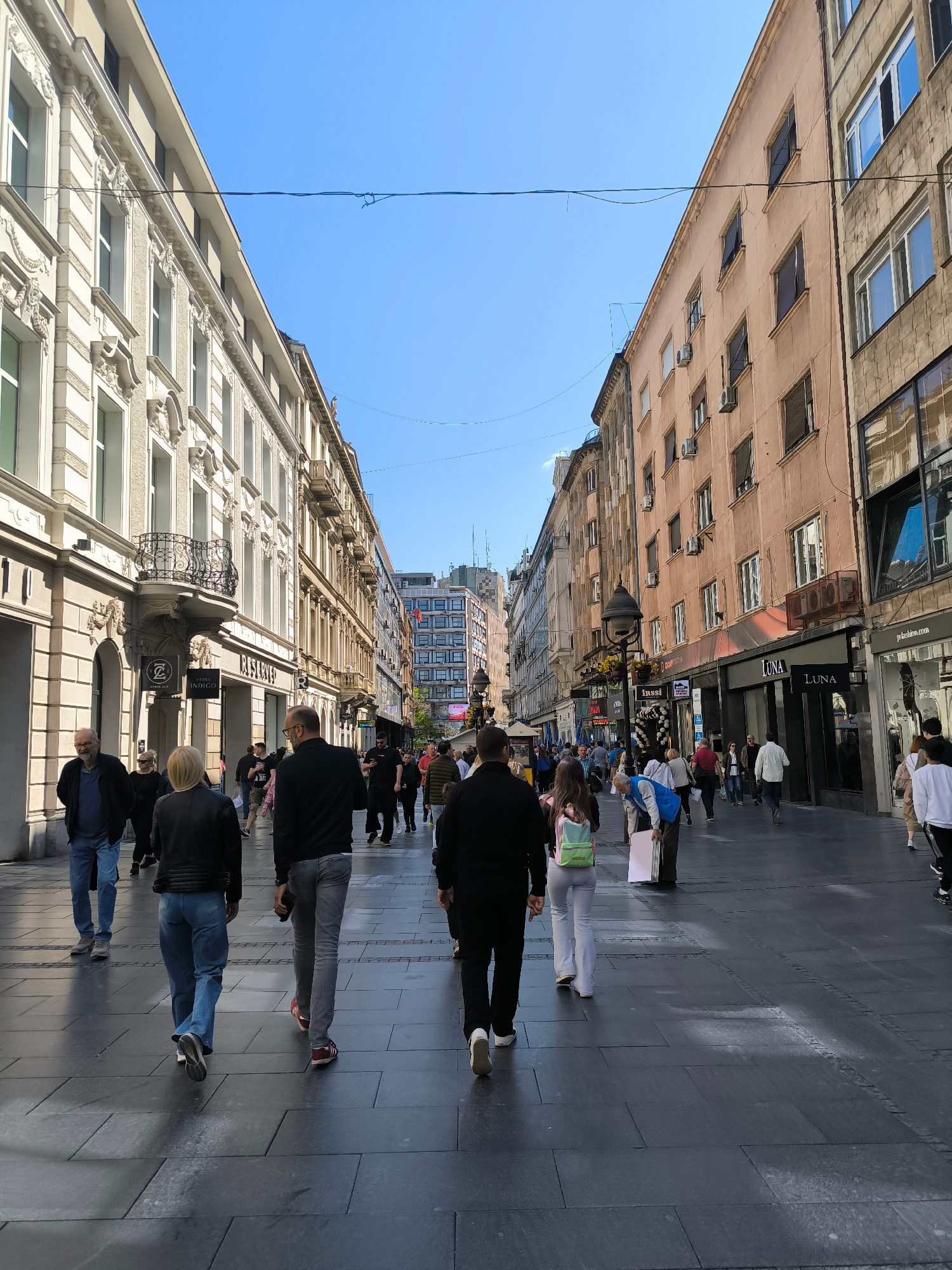 The image shows a pedestrian street in Belgrade, Serbia. The street is paved with dark gray rectangular stones. On either side of the street are multi-story buildings with various architectural styles…read more