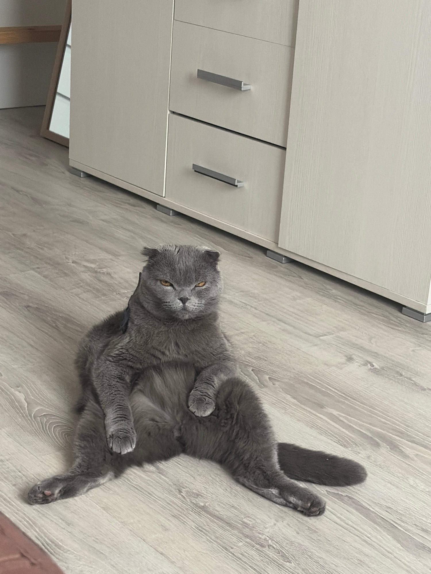 A gray Scottish Fold cat lies on its back on a light-colored wooden floor, next to a white dresser. The cat is positioned between the dresser and the right edge of the image. The location appears to b…read more