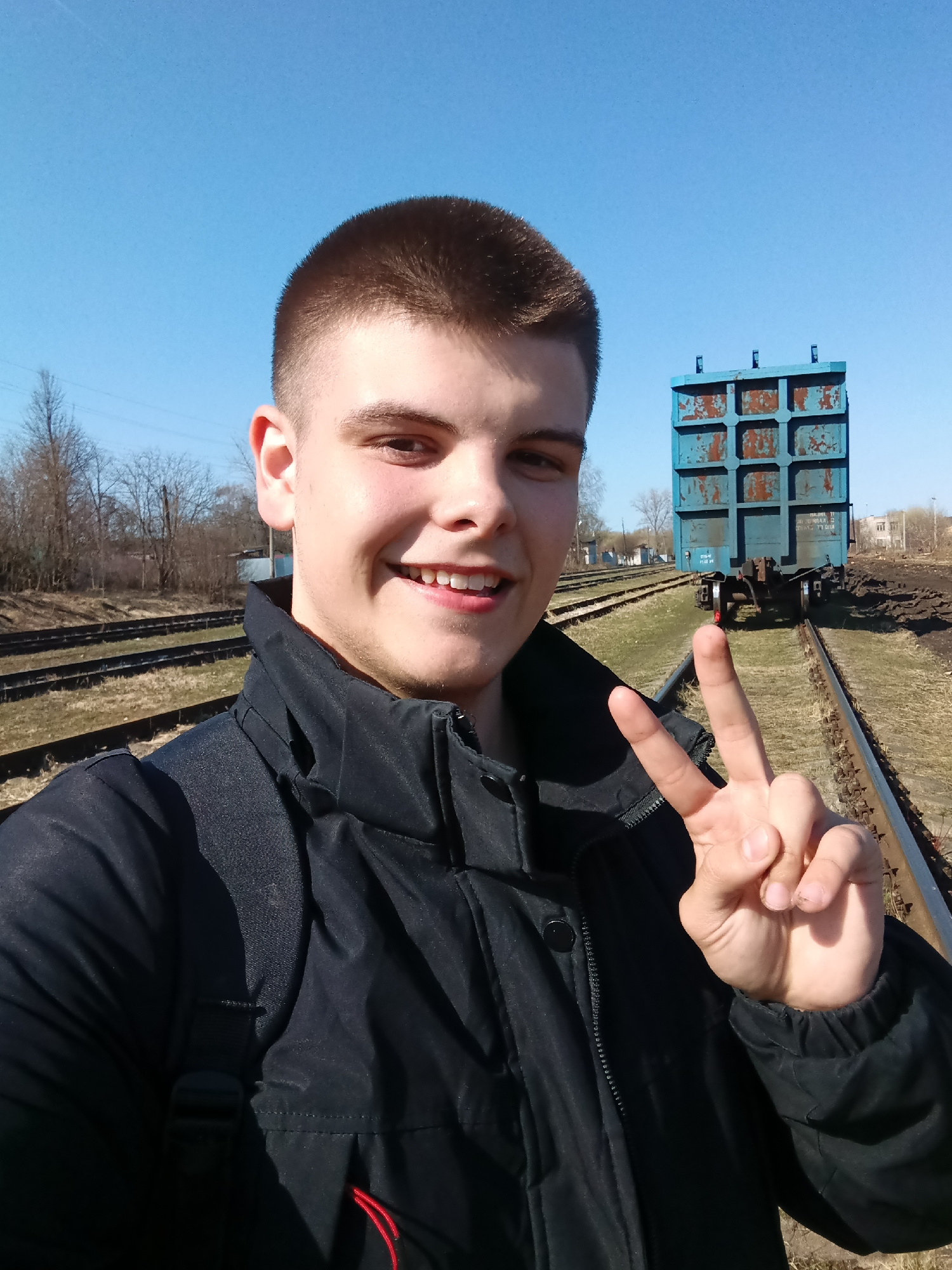 A young man takes a selfie in Andreyevo, Russia, with a train car behind him. He is smiling and holding up a peace sign. He wears a black jacket and a backpack. The background consists of train tracks…read more