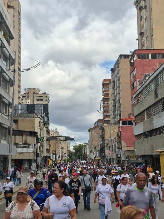 A dense crowd of people occupies a city street lined with diverse buildings under a cloudy sky. The group mostly wears white and moves in the same direction. Buildings vary in height and design, refleβ¦read more