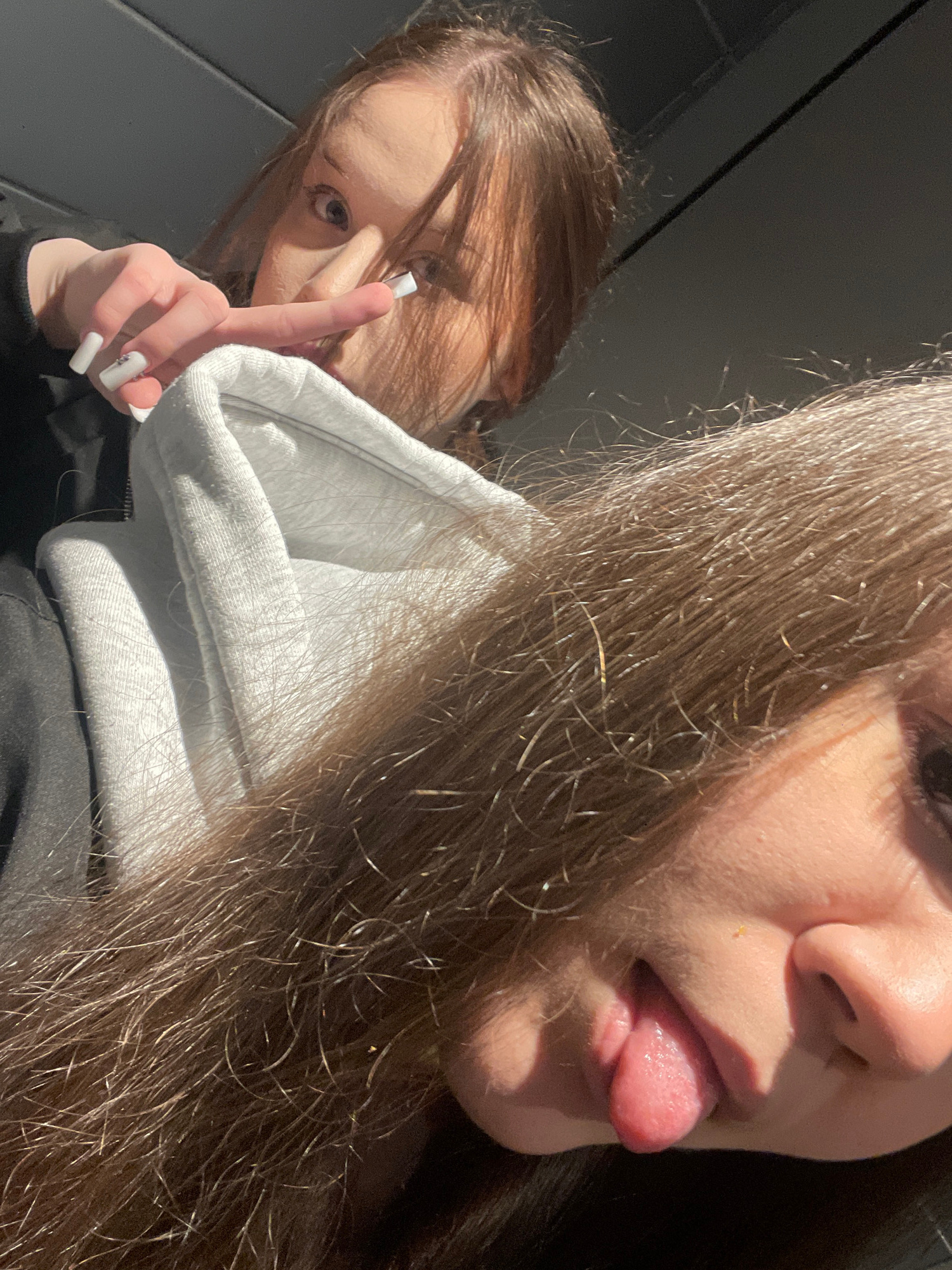 Two young women are pictured in what appears to be an indoor setting. The woman in the foreground is seen from the chest up, with her face turned to the right of the frame. She has long brown hair. He…read more