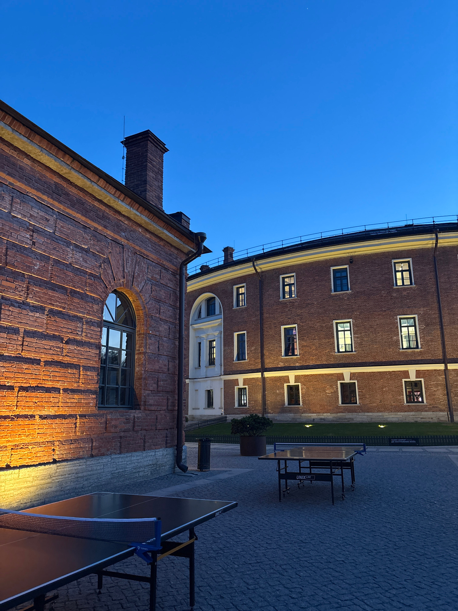 The image shows a street scene in Saint Petersburg, Russia, taken at twilight. The sky is a gradient of deep blue. Brick buildings line the street, with windows illuminated from within. A distinctive…read more