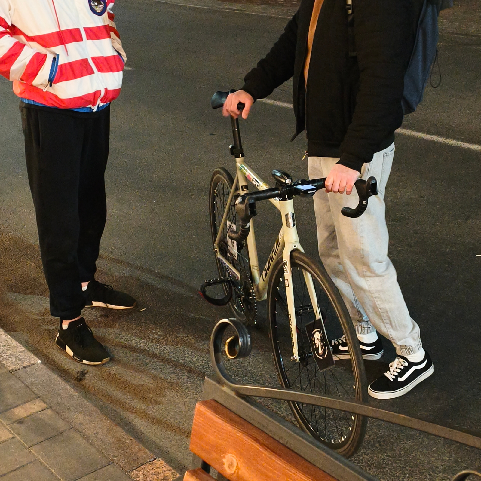 The image shows two people standing near a bicycle and a bench. One person is wearing a red and white striped jacket, black pants, and black sneakers with white accents. The other is wearing a black j…read more