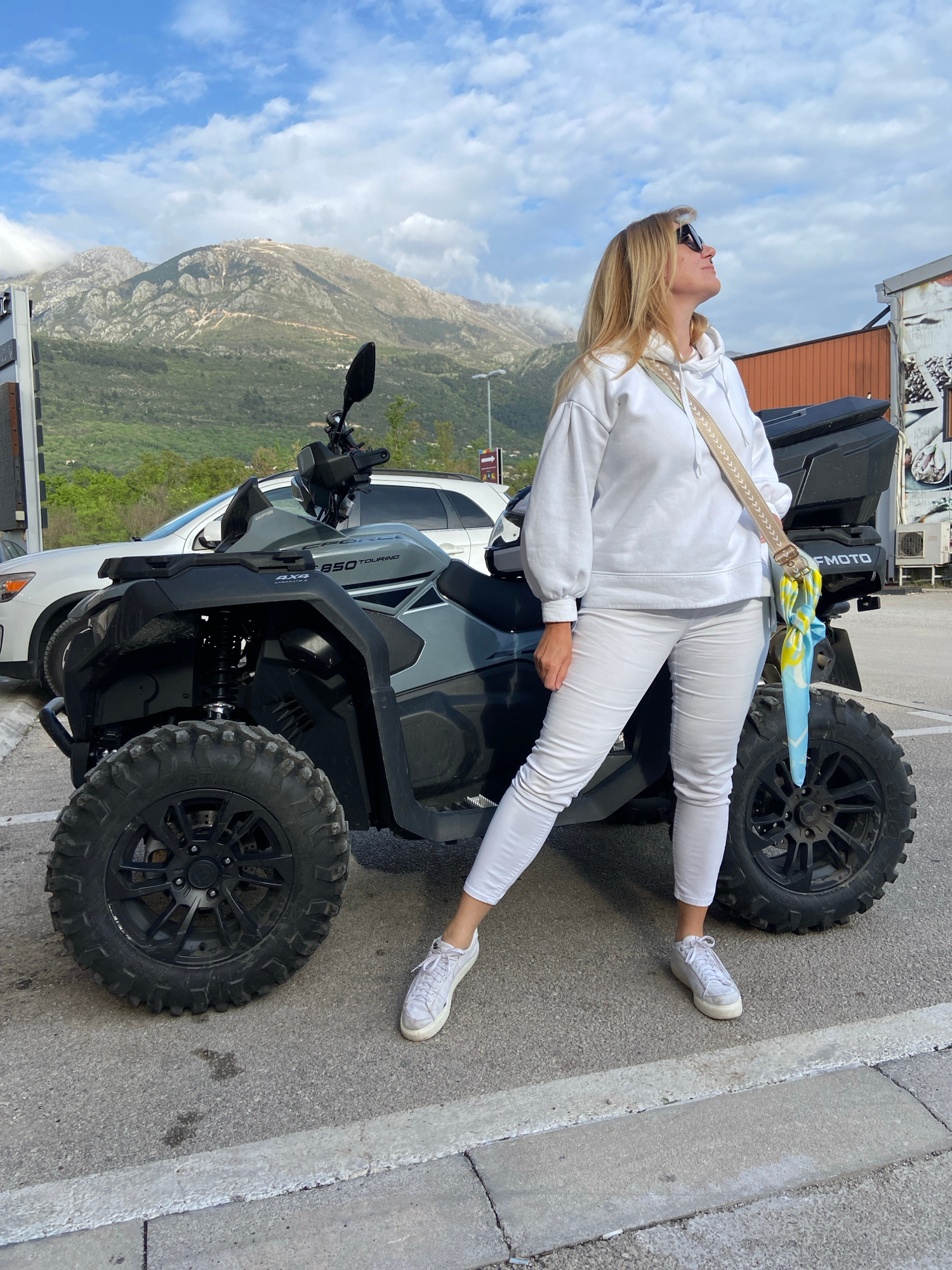 A full-body shot shows a woman lying across a black ATV. She wears white clothing and white tennis shoes. Her blonde hair falls back over her shoulders. She has sunglasses on. Behind the ATV, a mountaβ¦read more