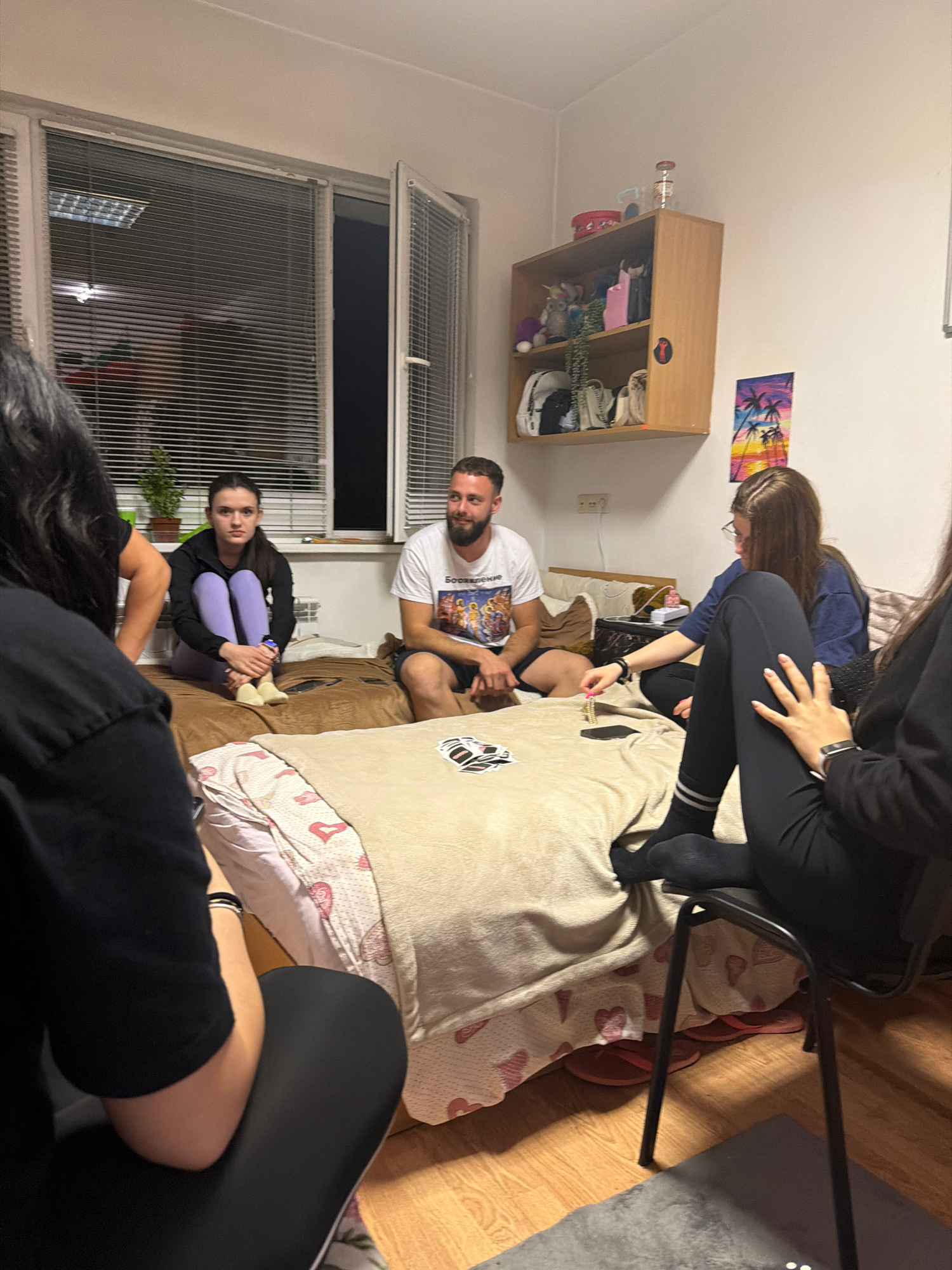 **Location:** Plovdiv, Bulgaria **Scene:** An indoor gathering of several individuals. **People:** * A man with a beard wearing a white t-shirt and shorts is sitting on a bed. * A woman in blac…read more