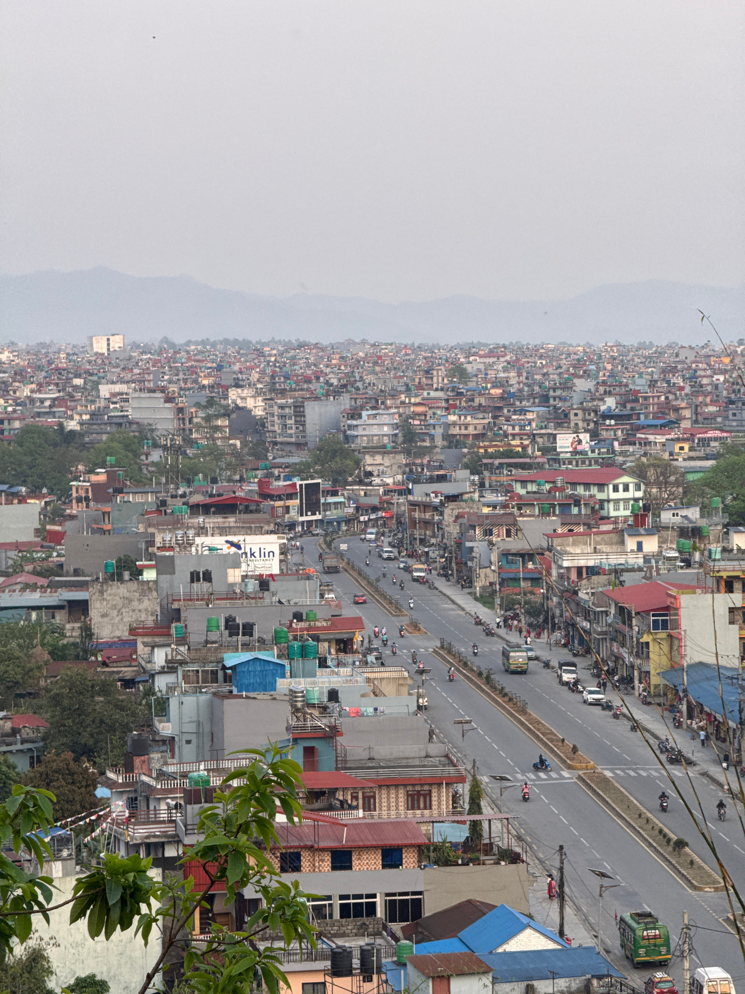The image shows a densely populated area, likely a cityscape in Pokhara, Nepal. The foreground includes trees and foliage. The cityscape is characterized by closely packed buildings of varying heights…read more