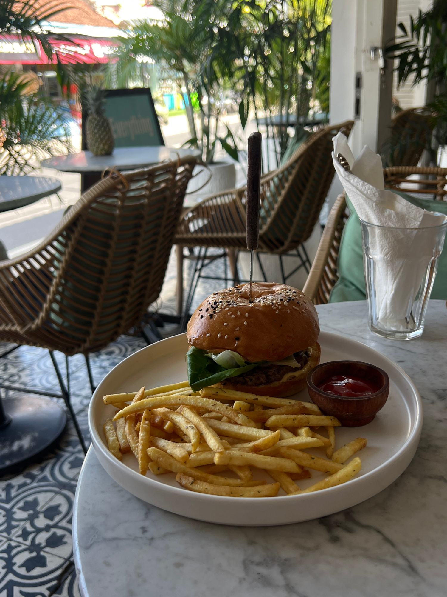 The image shows a burger and fries meal served on a white plate, accompanied by a small wooden bowl of ketchup. A knife is piercing the burger. A glass filled with napkins is next to the plate on a ma…read more