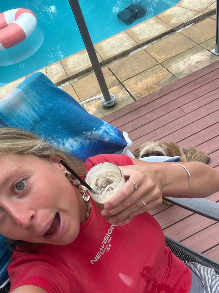 A woman in a red shirt holds a drink with ice. She wears rings, a bracelet, and a seashell necklace. A blue towel with a cloud pattern is draped behind her. A pool with a pool cleaner and a red and wh…read more