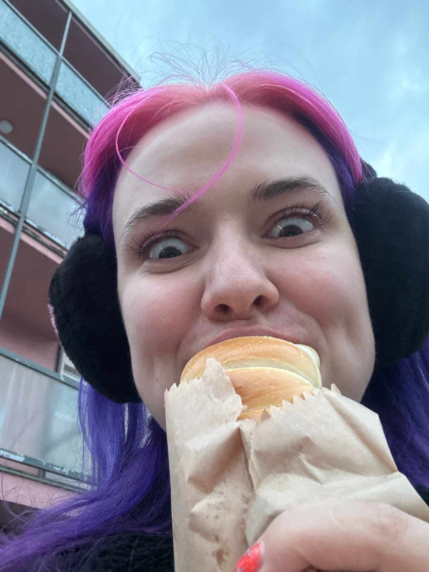 A close-up, rotated selfie features a young person with two-toned hair (pink and purple) wearing black earmuffs. The person is holding a sandwich in a brown paper bag and taking a bite. The bottom of…read more