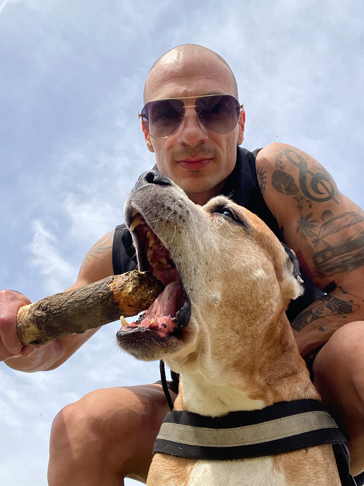 A low-angle shot depicts a bald man wearing sunglasses, holding a stick for a tan and white dog to chew on. The man has visible tattoos on his right arm. The dog is wearing a black harness with gray r…read more