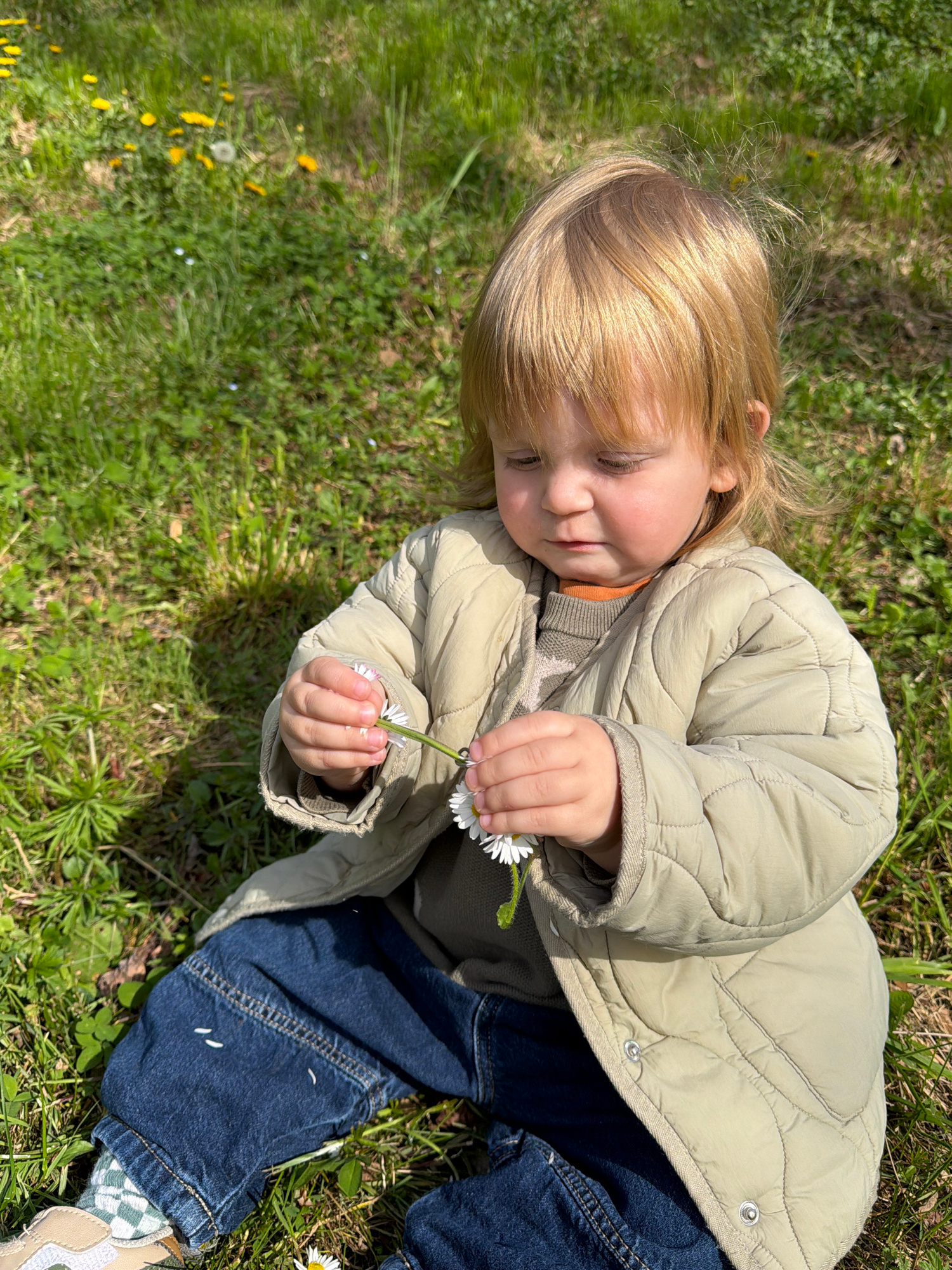 A young child is depicted seated on the ground in a grassy outdoor area within the city of Erba, Italy. The child has light blonde hair and is dressed in a light beige quilted jacket over a visible or…read more