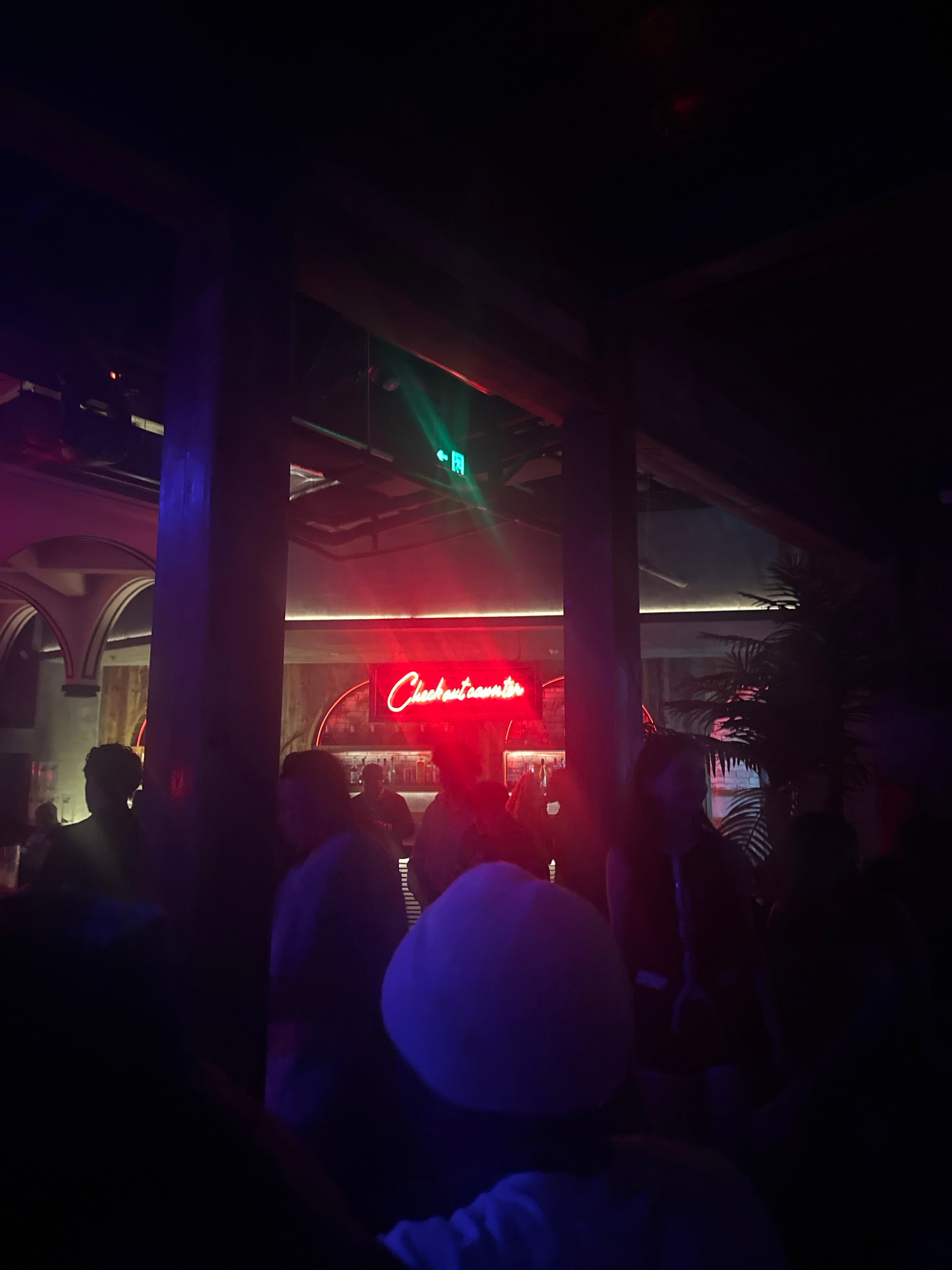 The image, taken in Xuanwu District, China, shows an interior view of a crowded bar or restaurant. A red neon sign, "Check out some," is visible in the background. People are present, though their fea…read more