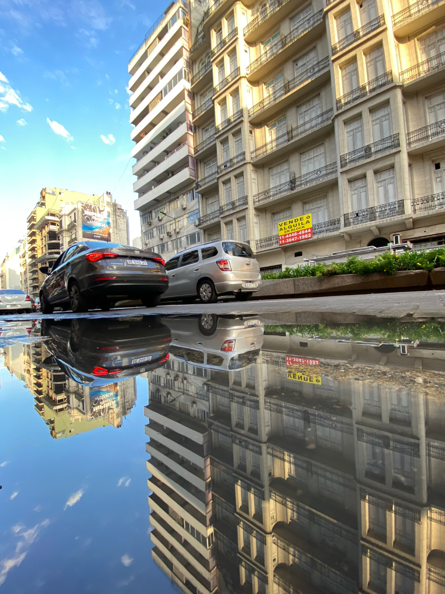 The image is a reflection of a street scene in Buenos Aires, Argentina, captured in a glass surface. A silver Chevrolet Corsa and a dark-colored Fiat Cronos are parked side-by-side. The reflection alsβ¦read more