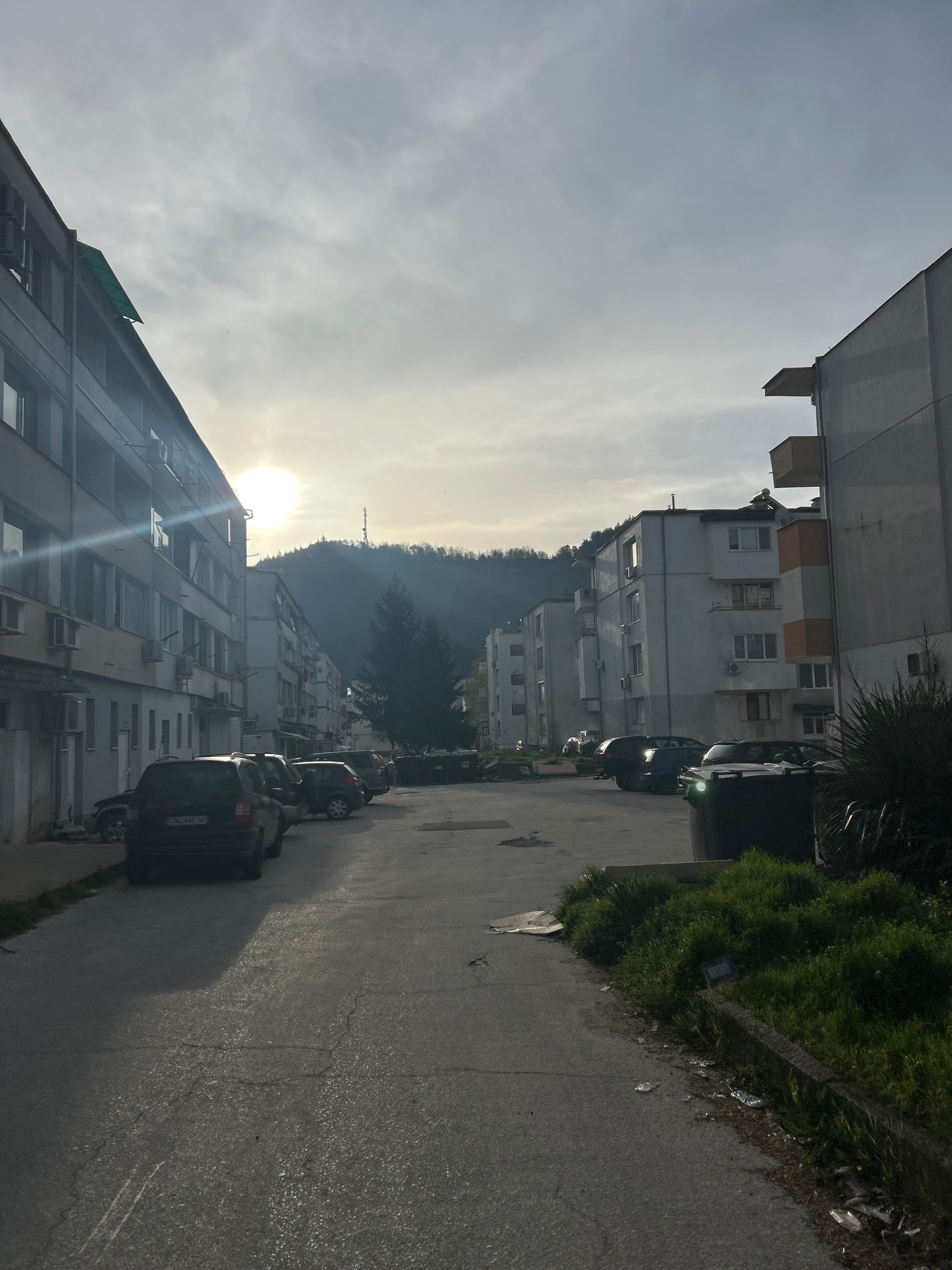 The image, captured in a portrait orientation, presents a residential street scene in Zlatograd, Bulgaria, under a hazy sky. On the far left side, a bright, low-hanging sun is partially obscured by ha…read more