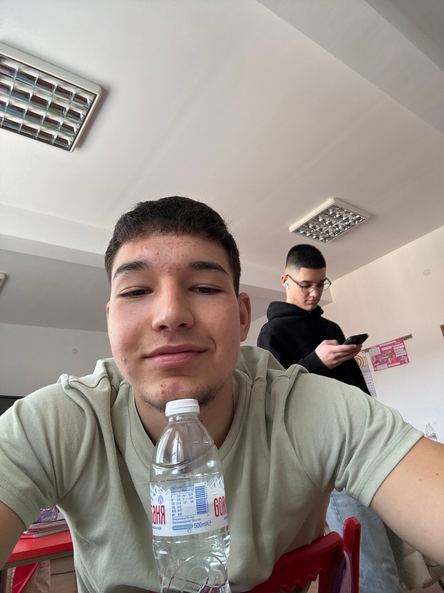 The image features two young men in an indoor setting. In the foreground, a young man with short dark hair, dark eyes, and some mild facial blemishes looks directly at the camera with a subtle, friend…read more
