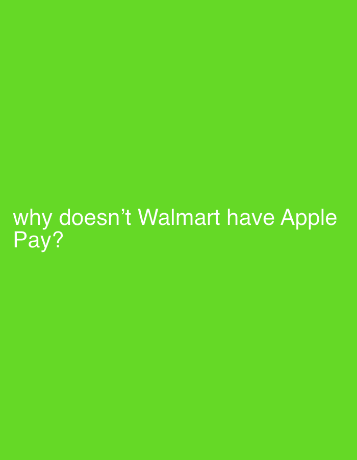 The image is a solid green background with white text that reads "why doesn't Walmart have Apple Pay?"