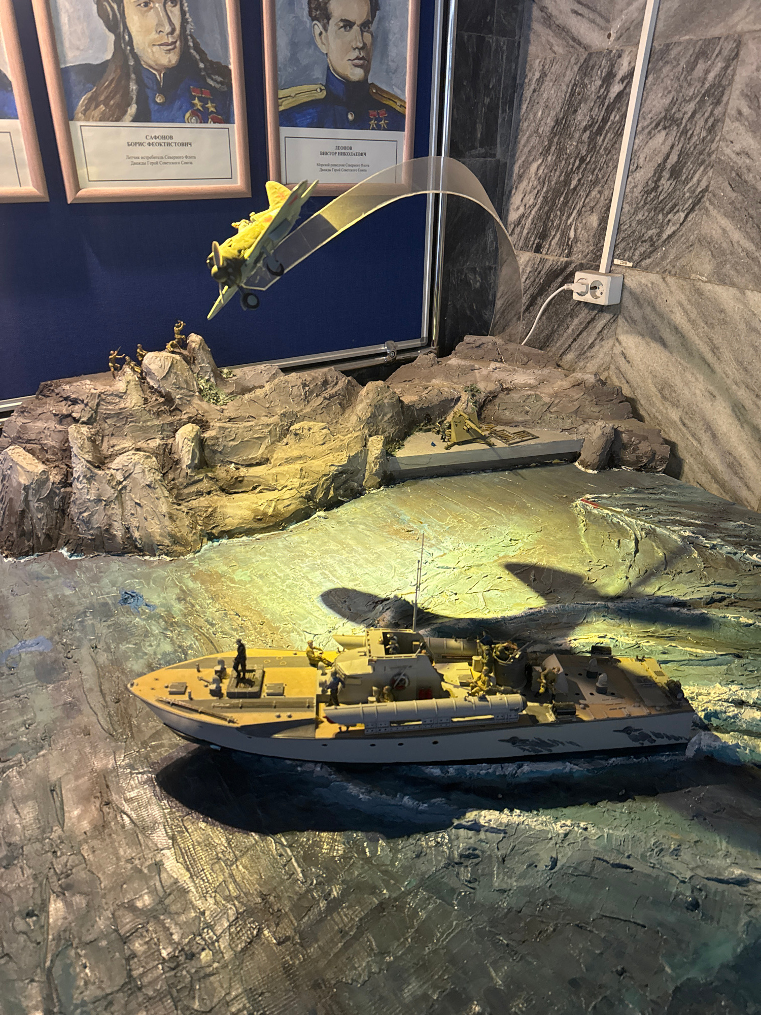 The image depicts a museum exhibit, likely located in Saint Petersburg, Russia, judging by the Cyrillic text on the portraits displayed. The exhibit showcases a diorama featuring a model warship navig…read more