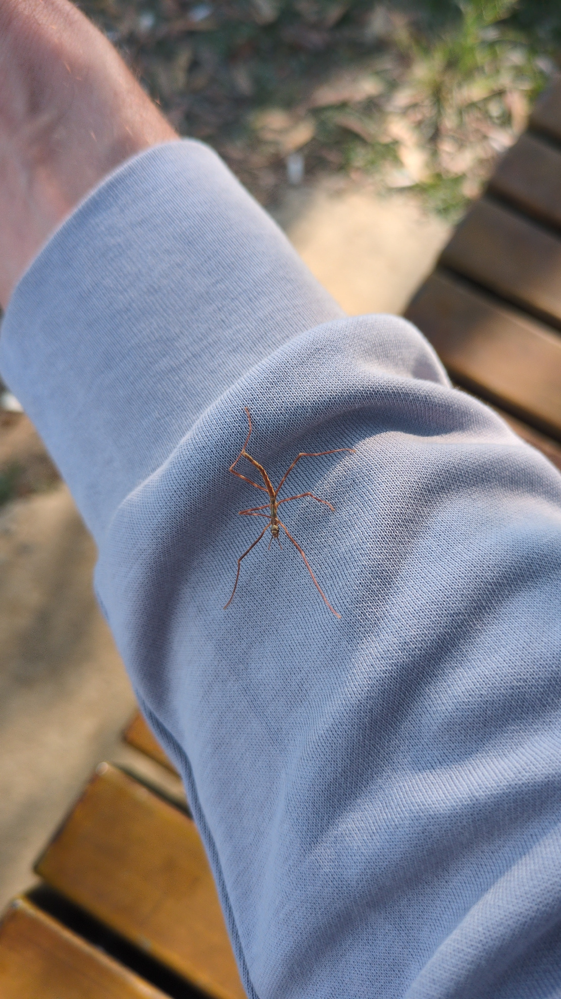 A stick insect clings to the sleeve of a light blue cotton shirt. The sleeve is part of an arm resting on a wooden bench, likely outdoors. The background suggests a park or garden setting, with hints…read more