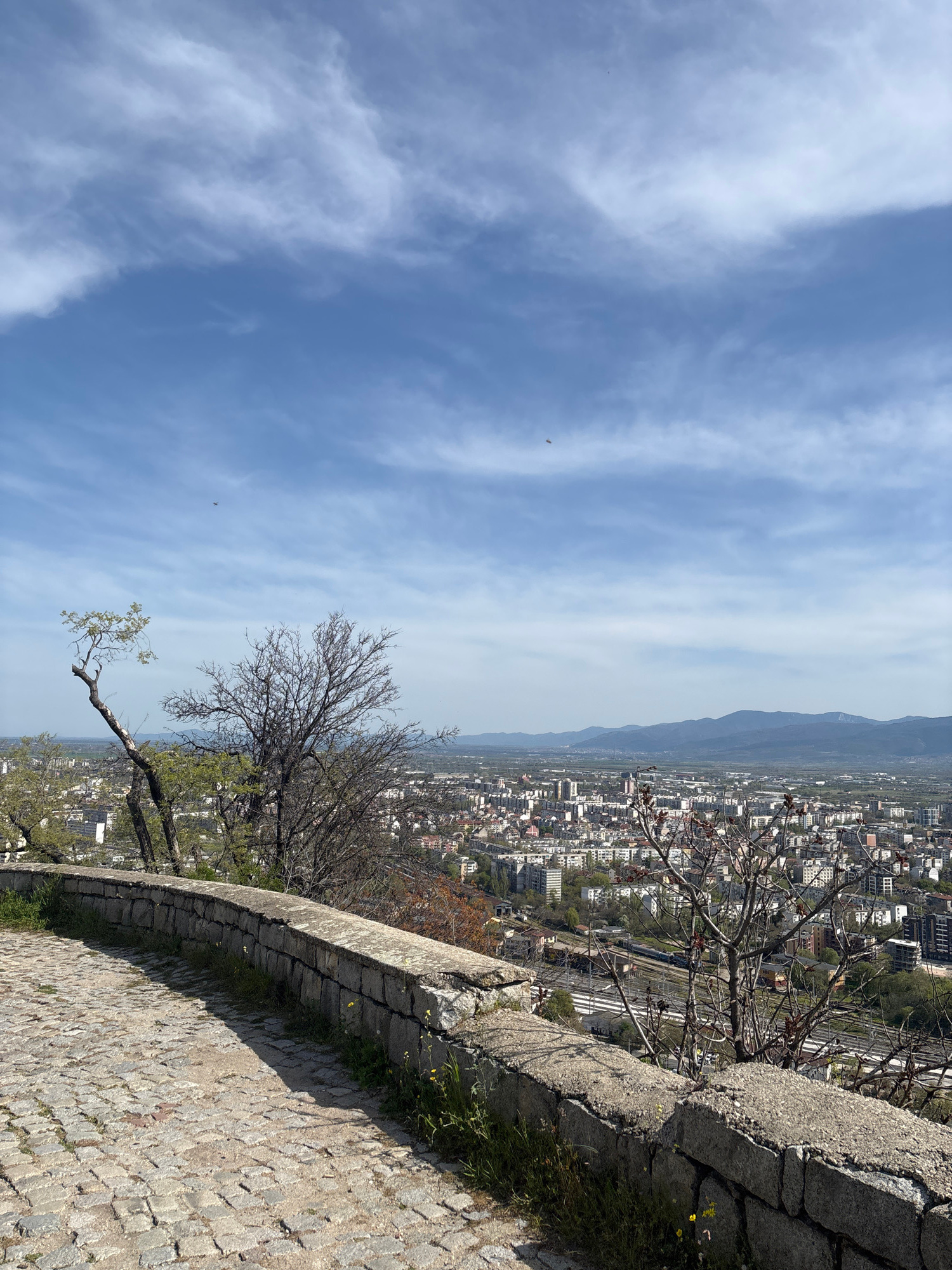 A panoramic landscape view captured from an elevated position overlooks a sprawling city under a clear blue sky. In the foreground, a curved cobbled path, possibly part of an old fortress or a park wa…read more