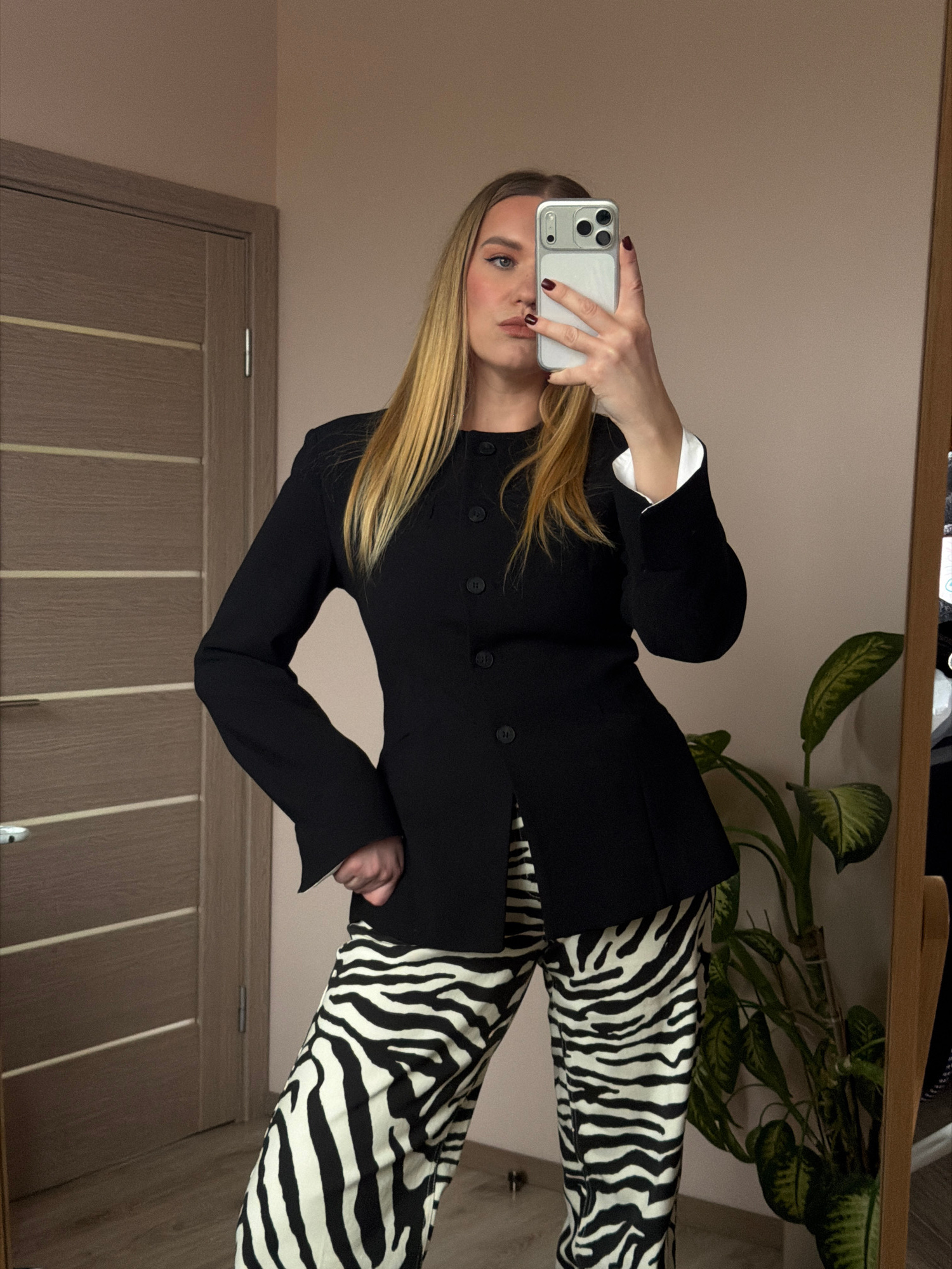 A woman takes a selfie in a mirror. She wears a black blazer and zebra-print pants. The background includes a plant, a door, and a beige wall. The location is likely indoors, with no specific indicato…read more