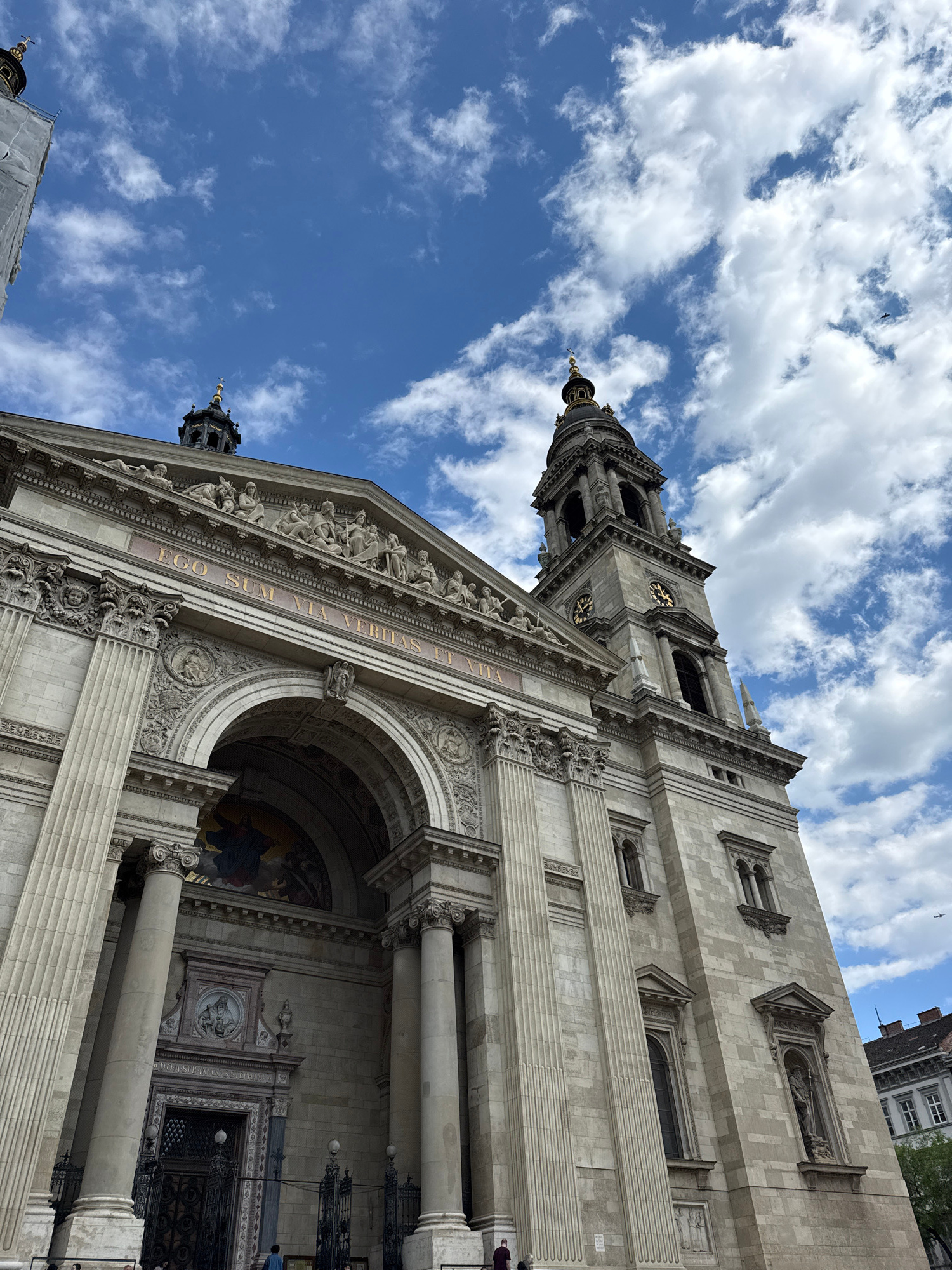 A low-angle, tilted photograph captures the imposing facade of a grand, ornate stone building, identified as being in Budapest, Hungary, likely St. Stephen's Basilica. The massive structure rises diag…read more