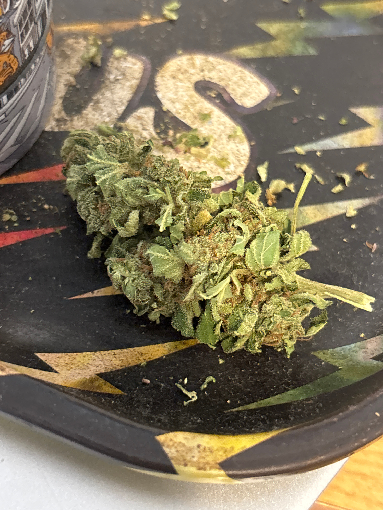 A close-up shot shows a cannabis bud on a black rolling tray. The tray has a colorful design with geometric shapes and lightning bolt patterns. The cannabis bud is green and appears to be trimmed. The…read more