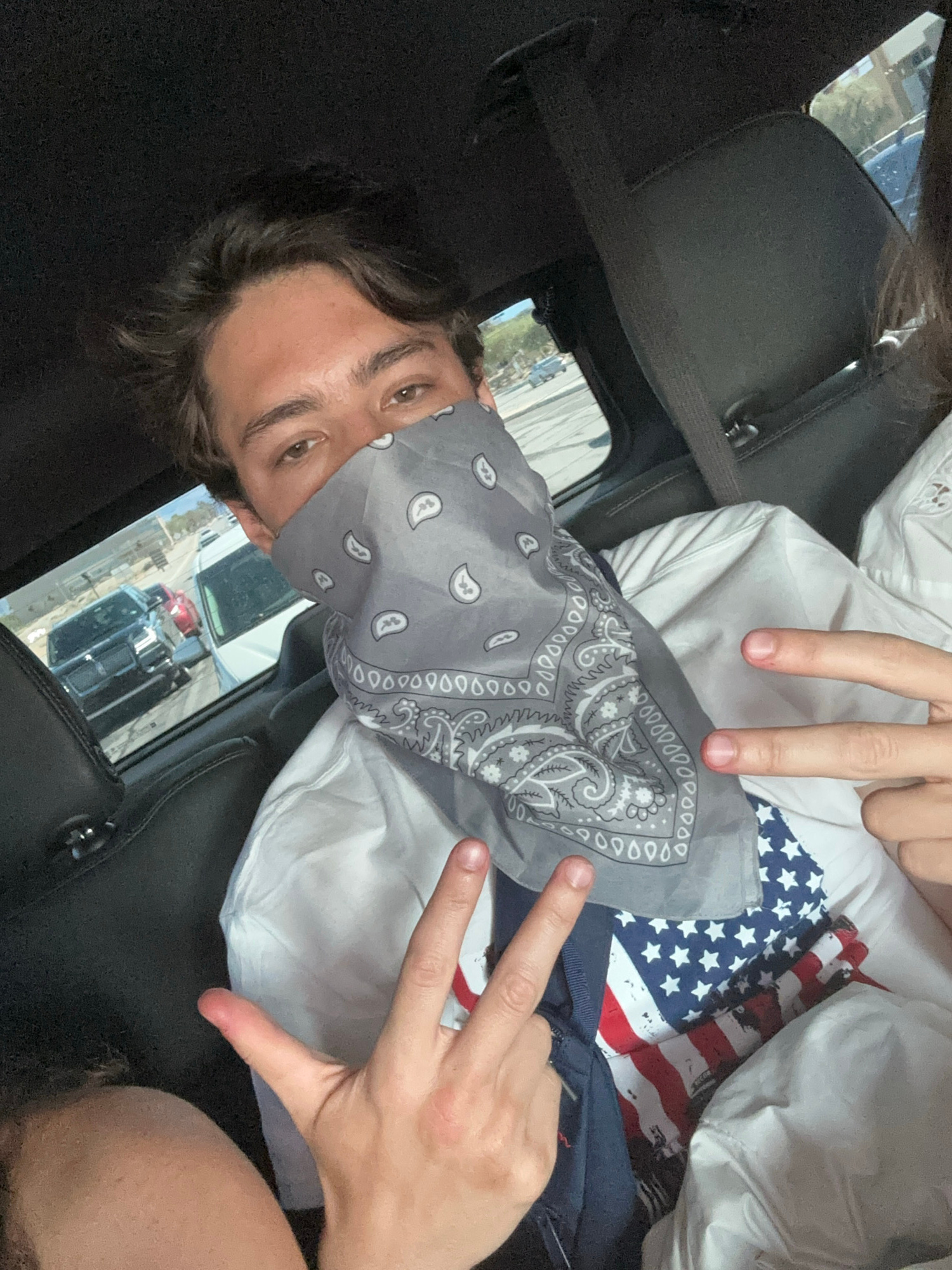 A man is in a car wearing a gray paisley patterned bandana over his nose and mouth. His light brown hair is long, and his eyes are brown. He is wearing a white shirt with an American flag bandana bene…read more