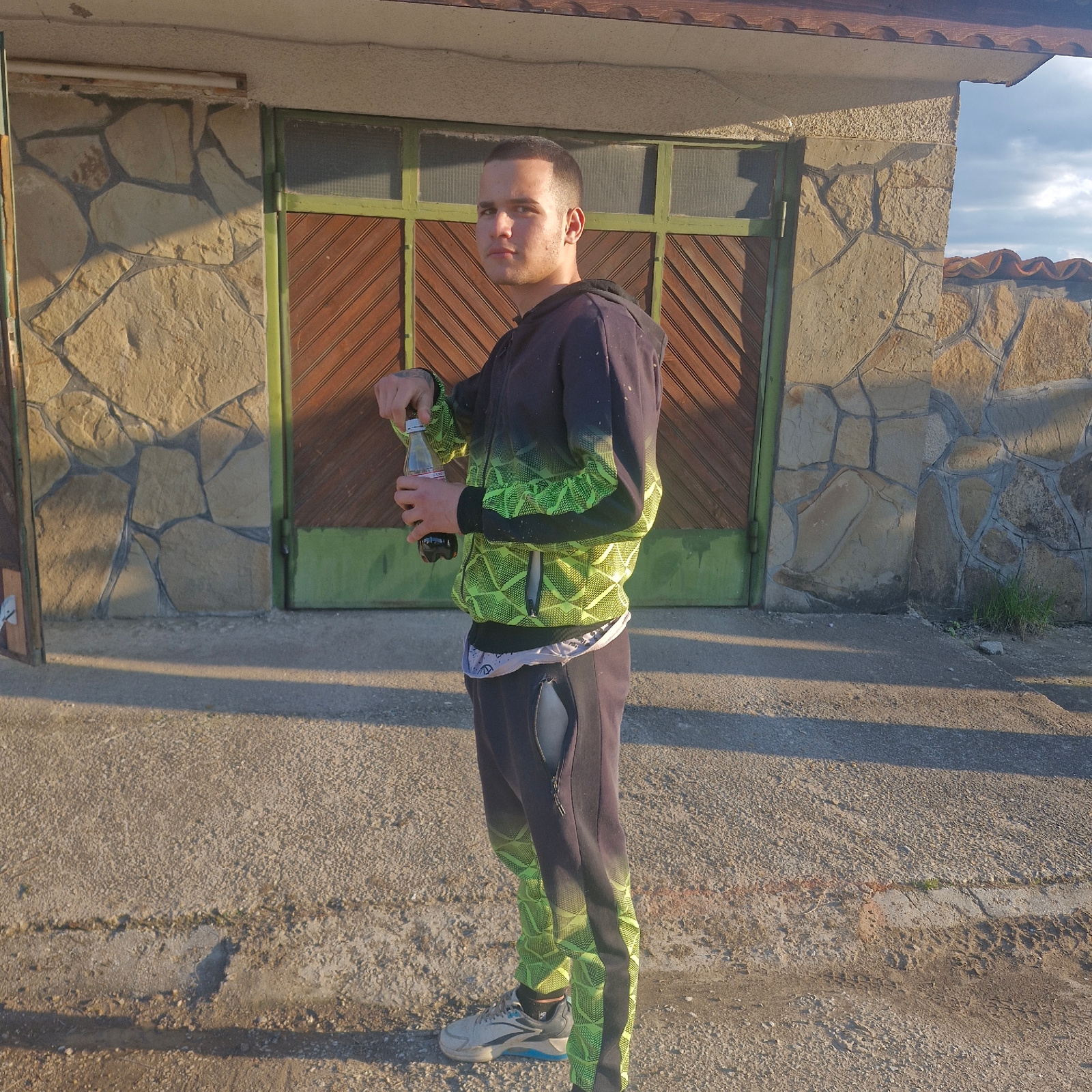 A man in a black and green tracksuit stands outside a stone building with a brown wooden door in Hirevo, Bulgaria. He is holding a bottle. The area is paved. The building is a single story. The sky is…read more