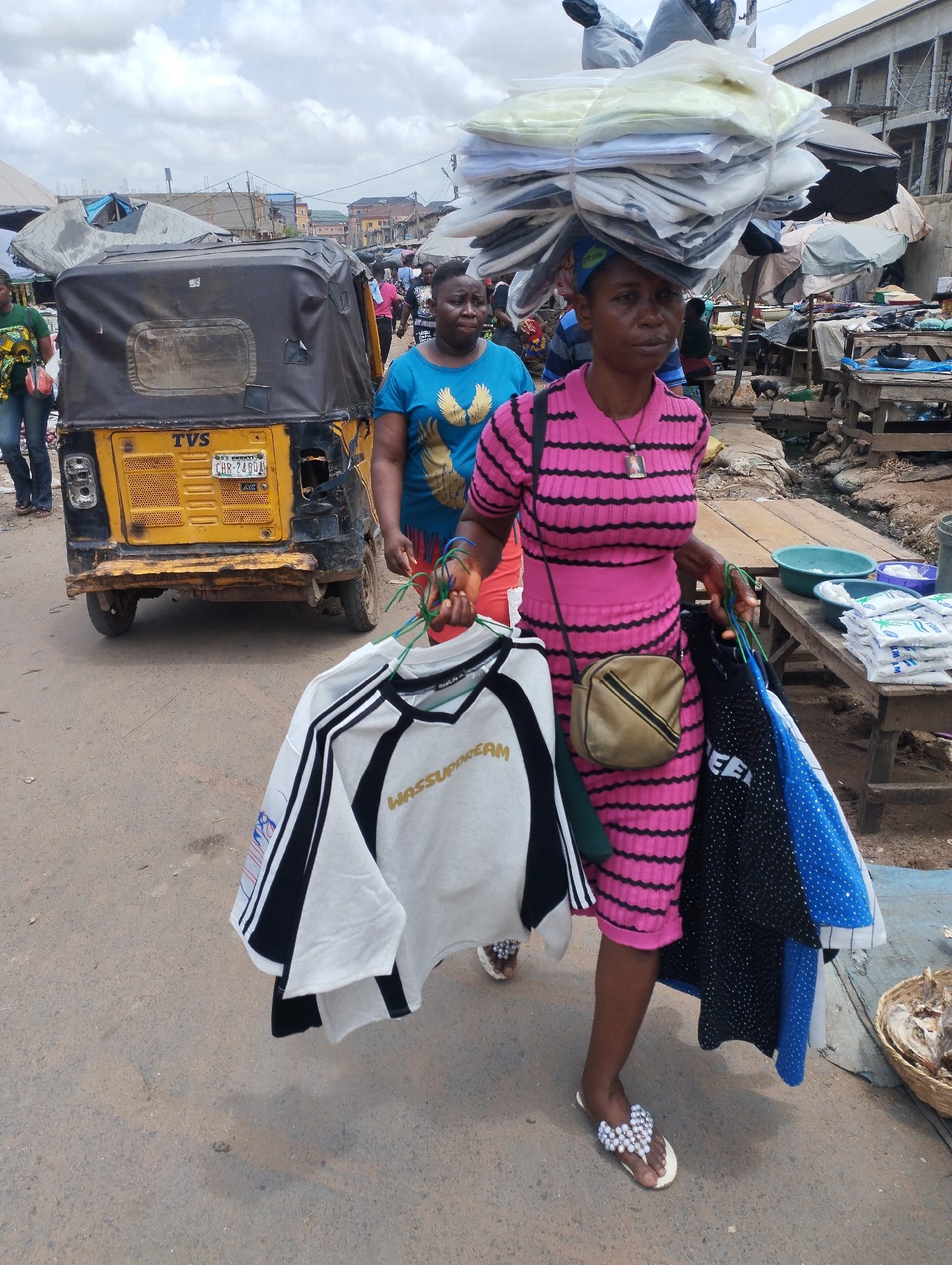 The image depicts a busy street scene in Fegge, Nigeria. A woman in a pink striped dress and beaded sandals is carrying items for sale. She has a large bundle of goods balanced on her head and severalโฆread more