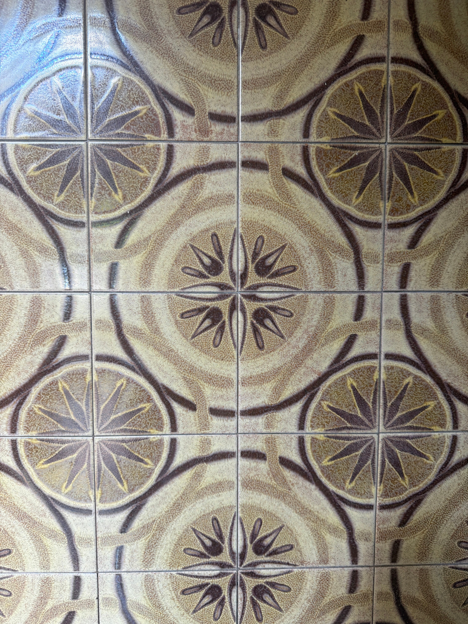 The image shows a floor covered in square ceramic tiles, arranged in a grid pattern. The tiles feature a repeating circular design in beige and brown tones. Each design consists of a central eight-poi…read more