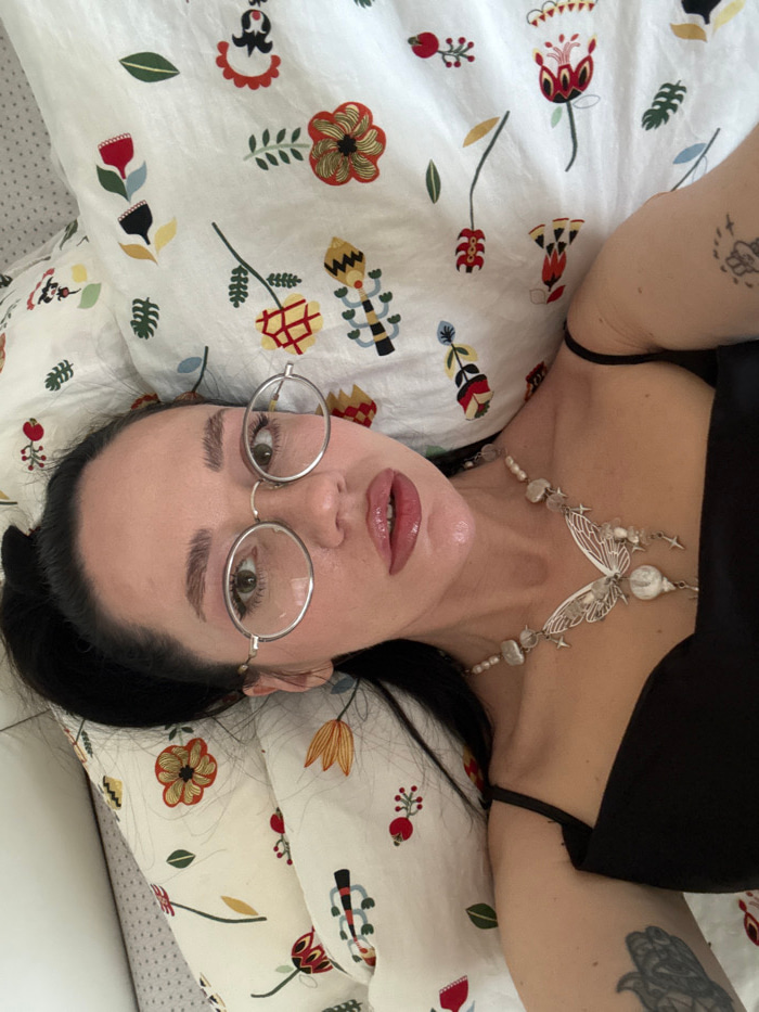 A woman lies on a bed with a floral-patterned comforter. She wears a black top, and a silver necklace with shells and stars adorns her neck. Her dark hair is pulled back. She is wearing round glasses.…read more
