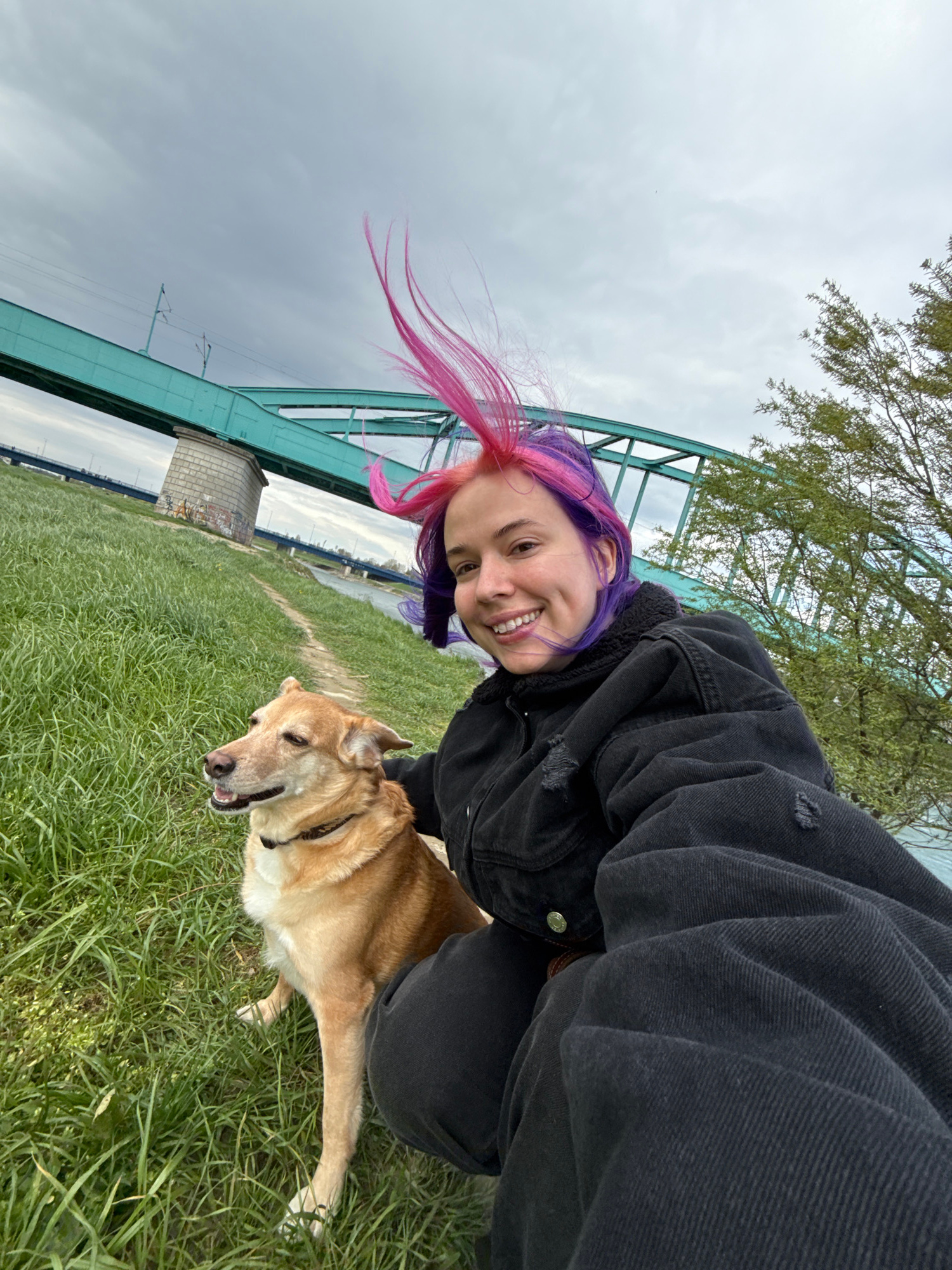 A tilted, close-up shot shows a young woman with brightly colored hair (pink and purple) crouching next to a light brown dog in a grassy area. The woman is smiling at the camera. She is wearing a dark…read more