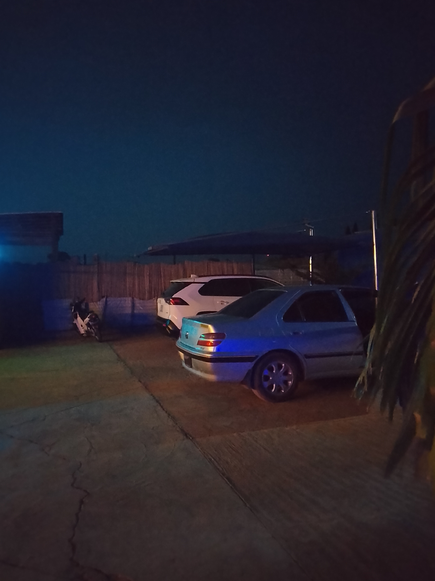 The image shows an outdoor parking area in Rido, Nigeria, at night. A white SUV and a light-colored sedan are parked under a dark carport structure supported by metal poles. A motorcycle is parked nex…read more