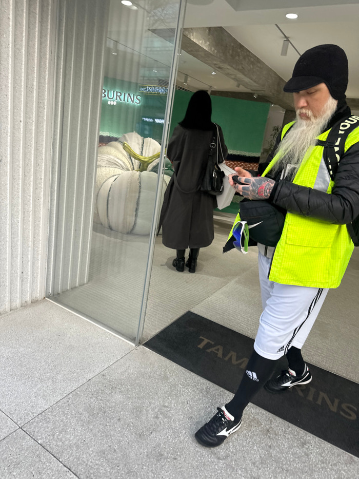 The image captures the entrance of a Tamburins retail store, likely located in Garosu-gil, Gangnam-gu, Seoul, South Korea, indicated by the "TAMBURINS" branded floor mat at the threshold. In the fore…read more