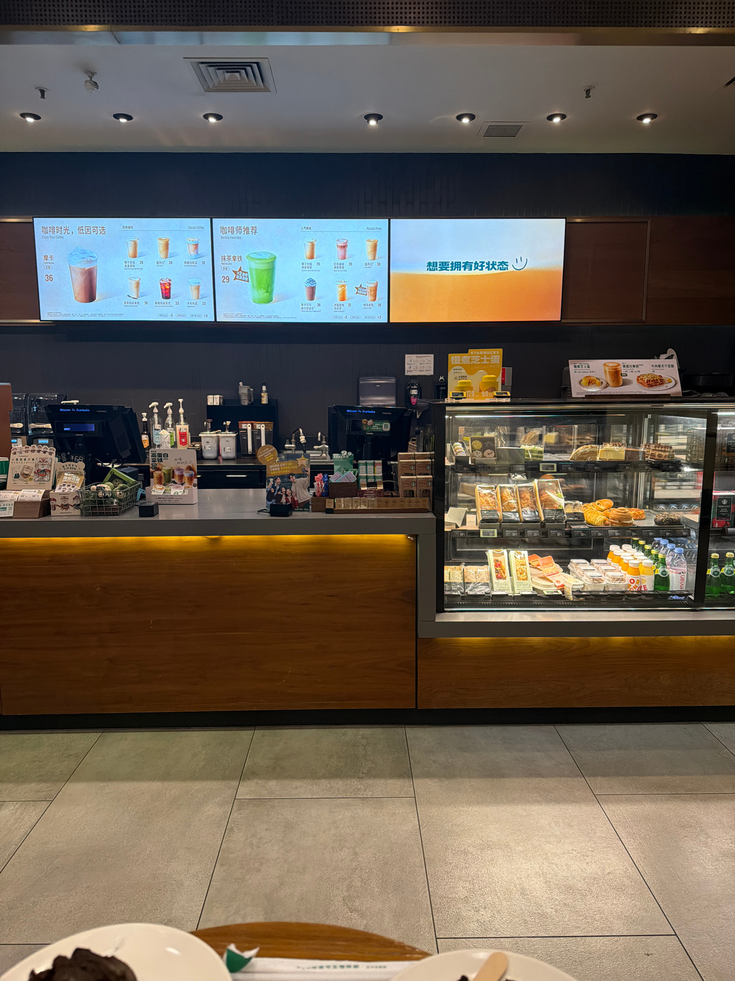 The image captures the interior of a brightly lit cafe, likely located in Yuhuatai District, China. The primary subject is a service counter with a prominent display case filled with various food and…read more