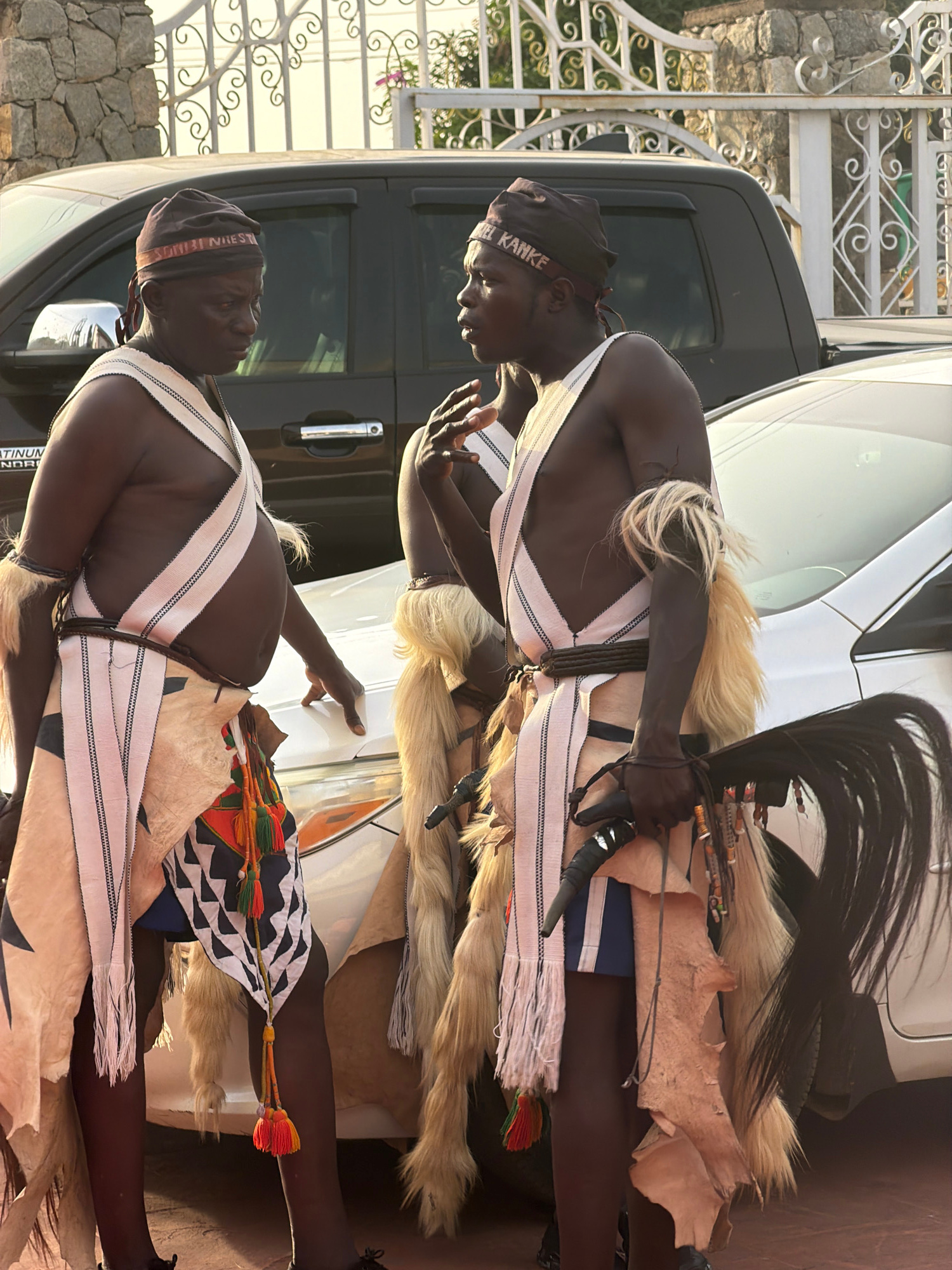 Two dark-skinned men are standing in front of a white vehicle, likely in an urban setting. The men are dressed in traditional garments consisting of white cross-banded straps over their bare torsos, l…read more