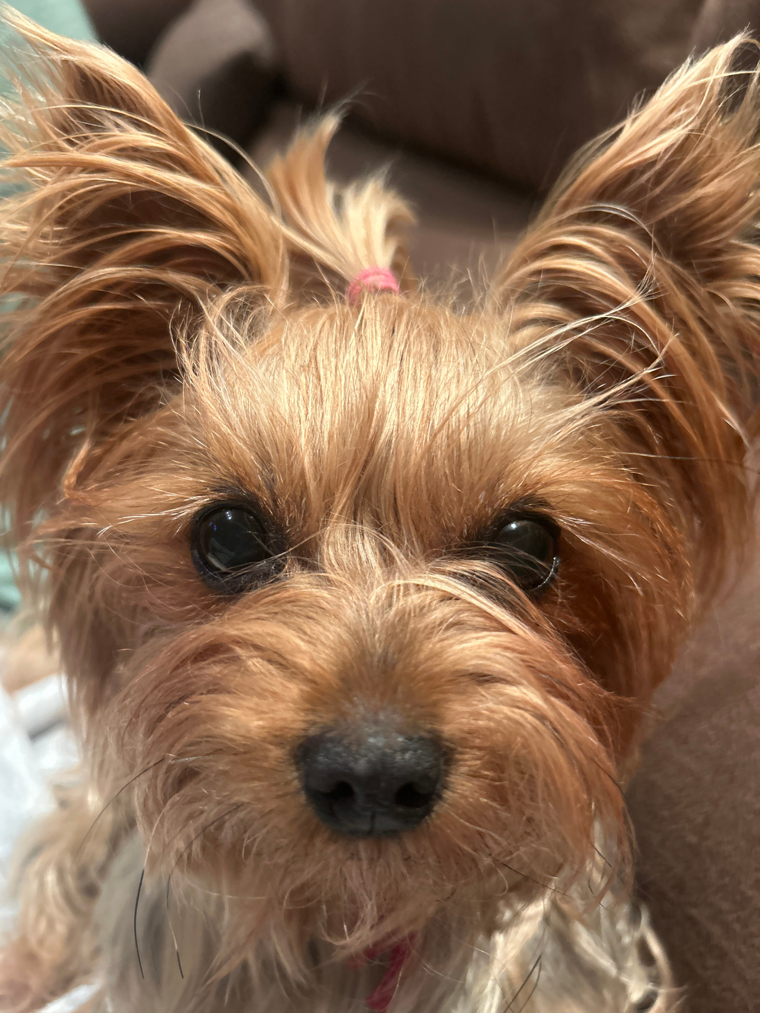 Close-up, downward-angled shot of a brown Yorkshire Terrier. The dog's eyes are black, and the nose is black and textured. A pink hair tie is visible in the dog's hair on the left side. The background…read more