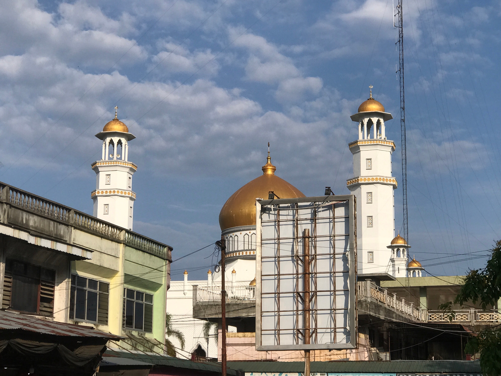 The image captures a vibrant street scene in Langsa, Indonesia, centered around a prominent mosque under a partly cloudy sky. The mosque features a large, central golden dome and two tall, ornate whit…read more