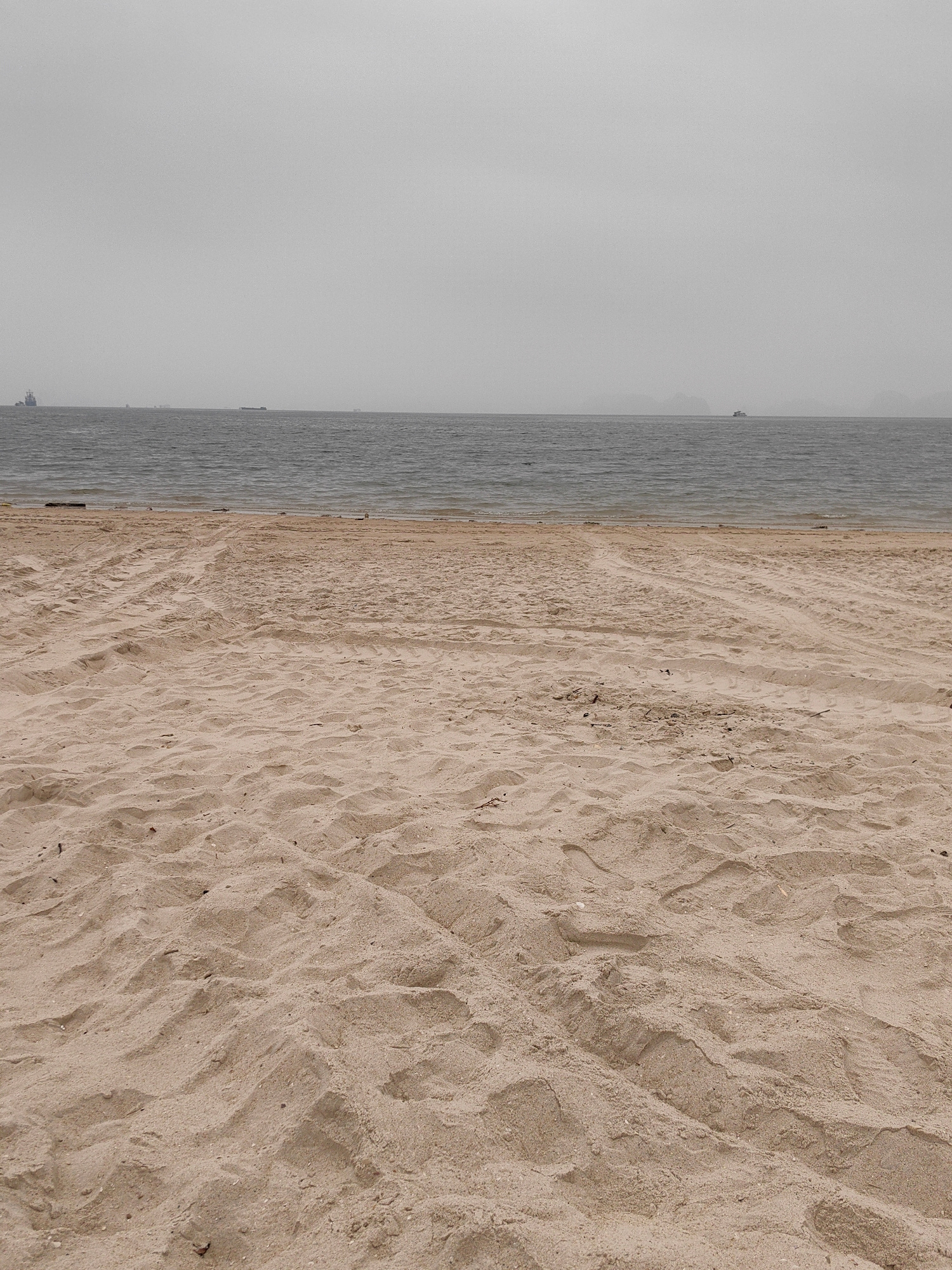 The image depicts a sandy beach in Bai Chay Ward, Vietnam, on a cloudy day. The beach is covered in beige sand with visible tire tracks. In the distance, the sea meets the horizon under an overcast sk…read more