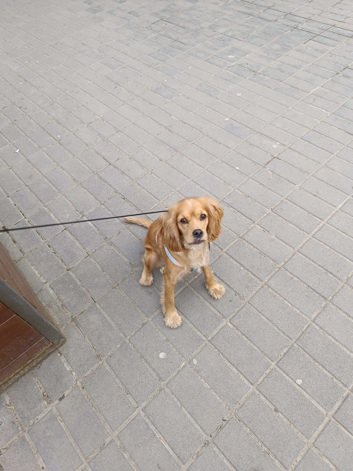 The image shows a Cocker Spaniel dog sitting on a gray brick paved surface. The dog is tan-colored and wearing a light blue harness. A black leash is attached to the harness and extends to the left si…read more