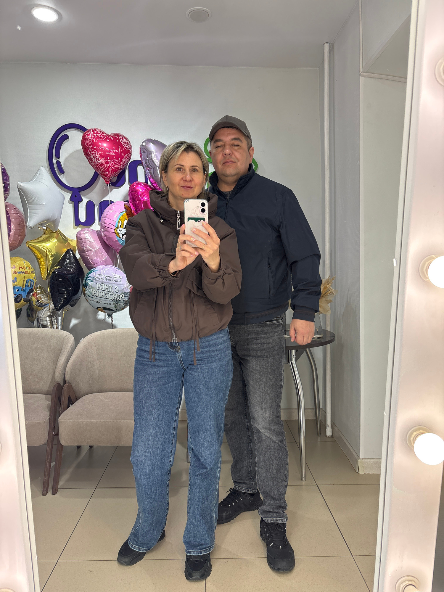 A middle-aged man and woman are posing for a selfie in a mirror. The woman is holding the smartphone. Behind them, there are several colorful balloons. In the background, a logo with the silhouette of…read more