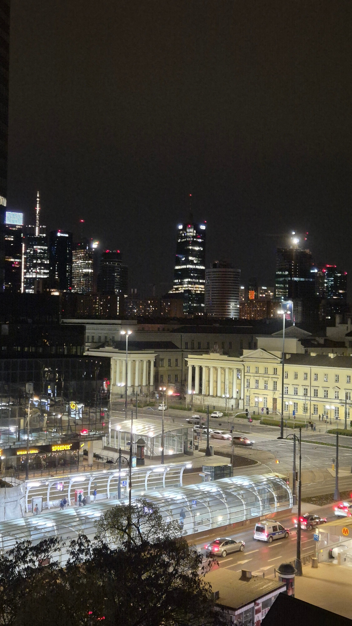 Captured at night, the image depicts a high-angle view of a cityscape in Warsaw, Poland. Buildings with illuminated windows and varying heights dominate the background. The foreground shows a street sā¦read more