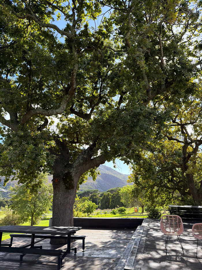 The image depicts an outdoor scene in Overstrand Nu, South Africa, under clear daylight. A large, mature tree with dense green foliage and a thick, textured trunk dominates the left and central upper…read more