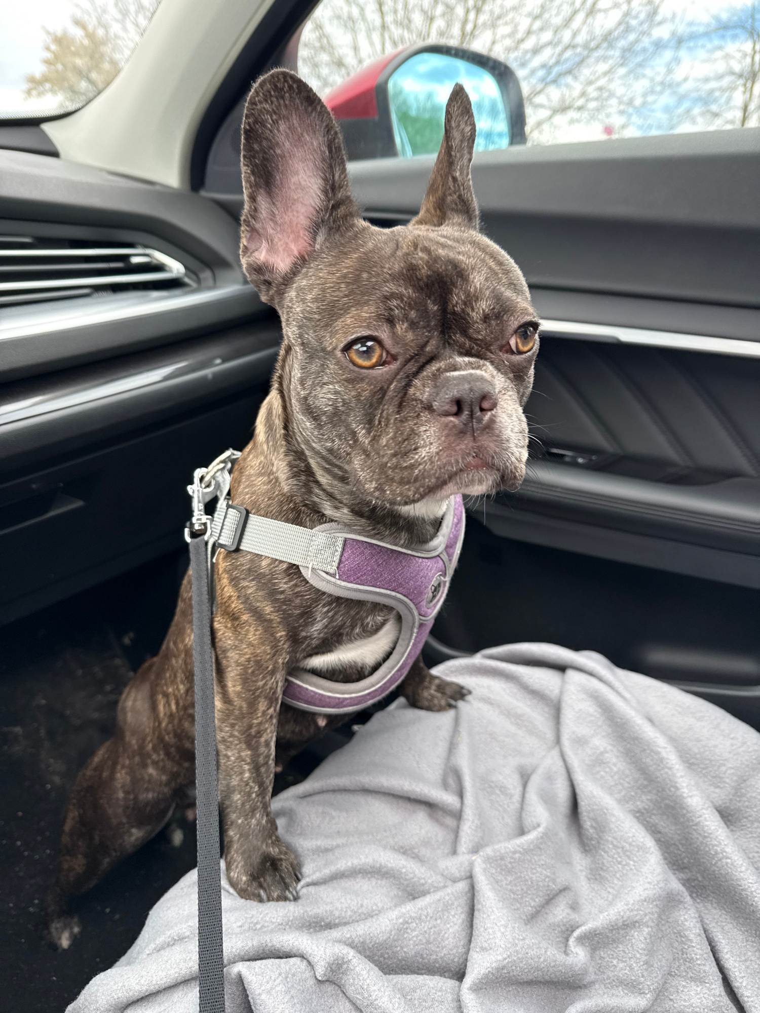 A brindle French Bulldog is the primary subject of the image, situated inside a vehicle. The dog is wearing a purple harness connected to a black leash. Part of a gray blanket is visible behind the do…read more
