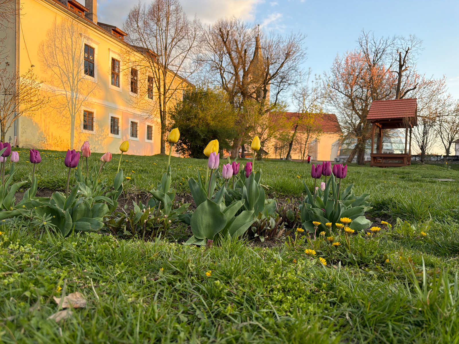 The image depicts a park landscape in Târgu Mureș, Romania, at sunset. In the foreground, purple and yellow tulips grow in a grass lawn interspersed with dandelions. Behind the tulips, a yellow two-st…read more