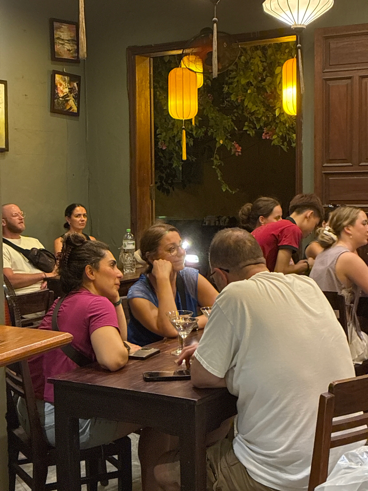 A group of people are seated at a wooden table in a restaurant setting. The scene is oriented vertically. A woman with dark hair and a pink shirt is seated closest to the viewer. Other people are visi…read more