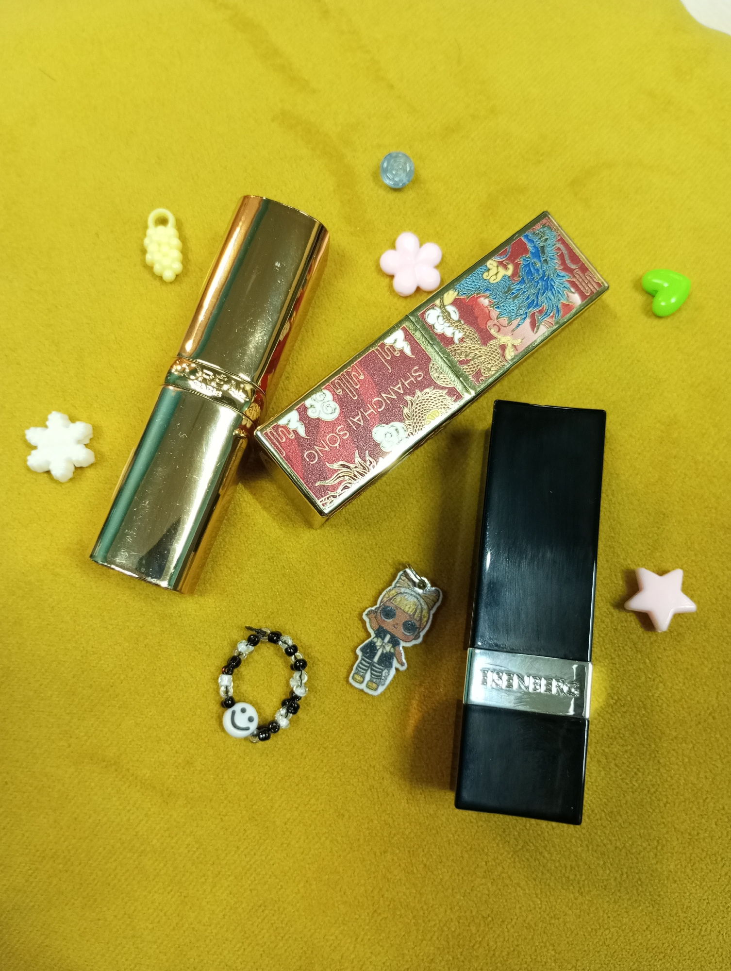 The image depicts three lipsticks and several small trinkets on a yellow surface. A gold-colored lipstick is to the left, a red lipstick with a dragon design is in the center, and a black lipstick is…read more