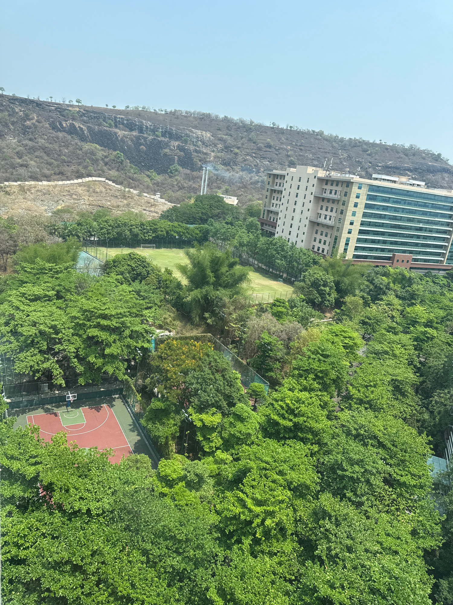 The image shows a landscape in or near Man, India. A multi-story building stands near the base of a mountain. Lush greenery surrounds the building. There's a sports field and a basketball court among…read more